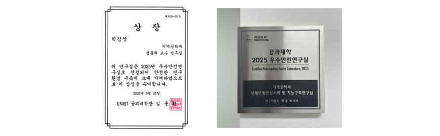 Our laboratory was selected for the Outstanding Safety Laboratory Award in 2025 in recognition of its strong commitment to research safety and excellence in creating a safe laboratory environment. The award was presented by the Dean of