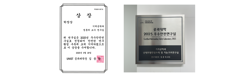 Our laboratory was selected for the Outstanding Safety Laboratory Award in 2025 in recognition of its strong commitment to research safety and excellence in creating a safe laboratory environment. The award was presented by the Dean of the College of Engineering, UNIST, on September 29, 2025.