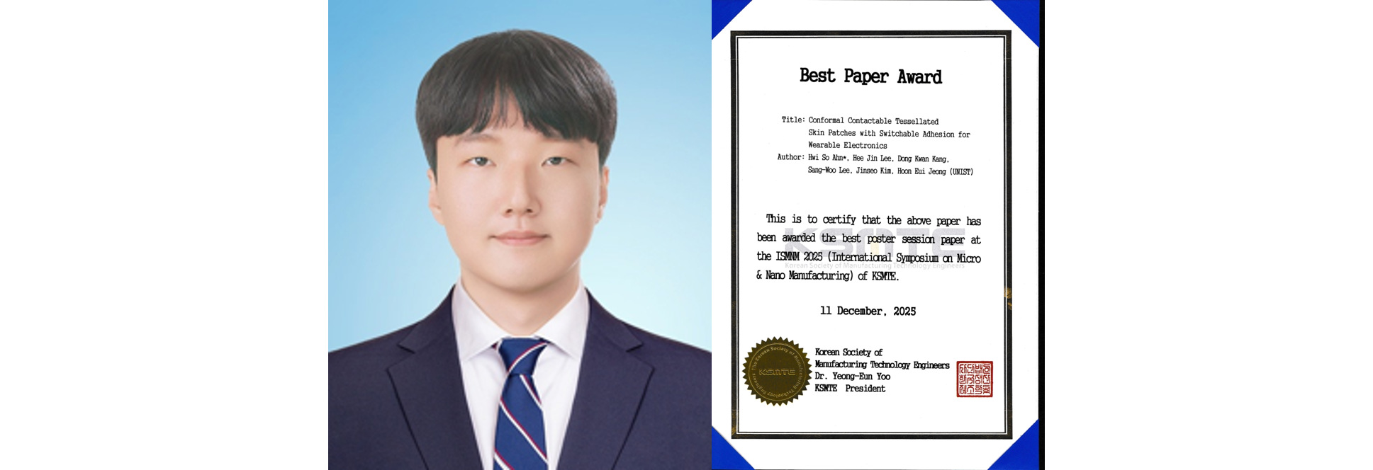 – Best poster award (The best poster award at KSPE, Seongjin Park) and the outstanding poster award (The outstanding poster award at KSME, Insol Hwang), 2020